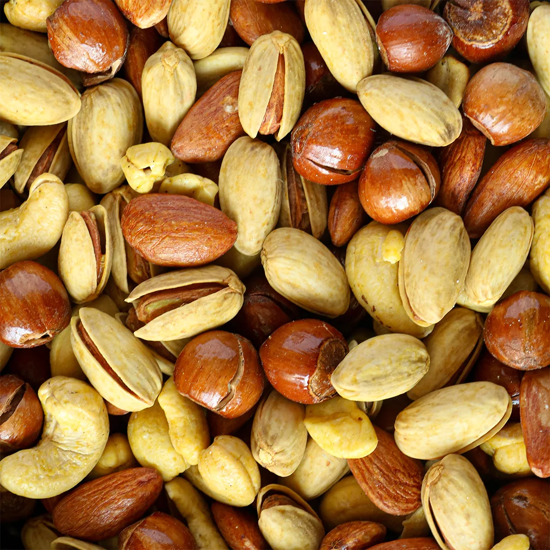 ترکیبات: پسته احمدی نمکی _ مغز بادام درختی نمکی _ بادام هندی زعفرانی _ مغز فندق نمکی